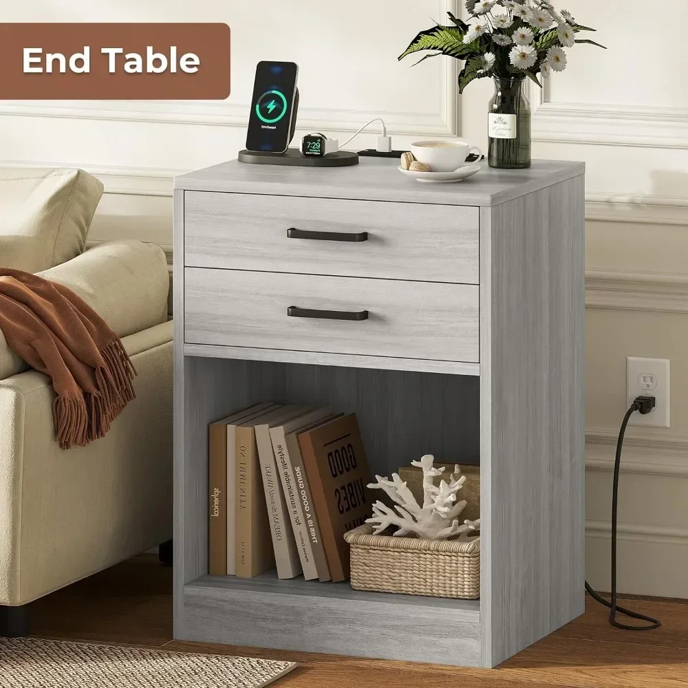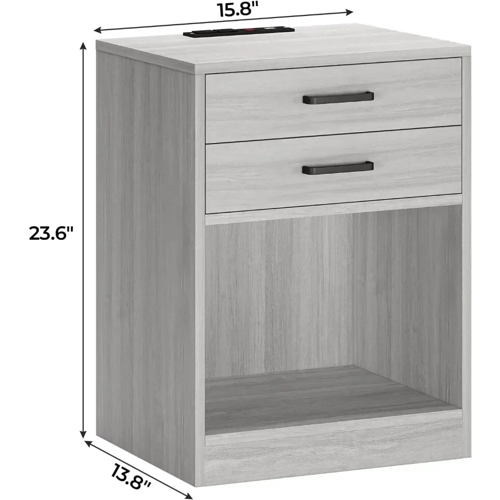 NIGHTSTAND WITH CHARGING STATION:The charging station includes an on-off switch,which strengthens the security.Also including 2 outlets,2 USB ports. It allows you to charge mobile devices such as cell phone, tablet etc.